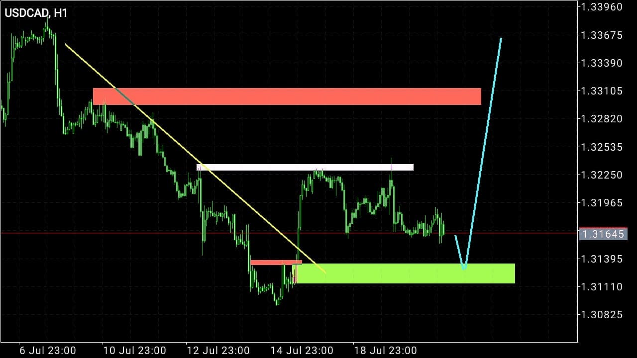 On July 18, 2023, I opened the MT4 platform, and found a matching pattern, USDCAD, on an hourly time frame. It was trading at the level of 1.3165 I expected it to reach the level of 1.3111 Where most of the purchase contracts are drawn up (retest area) After breaking the last bearish trend h1 At the level of 1.3240, as shown in( Figure A)